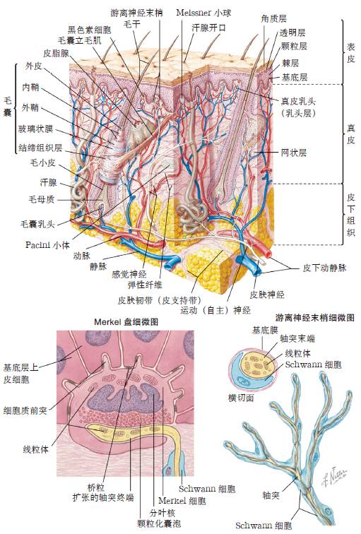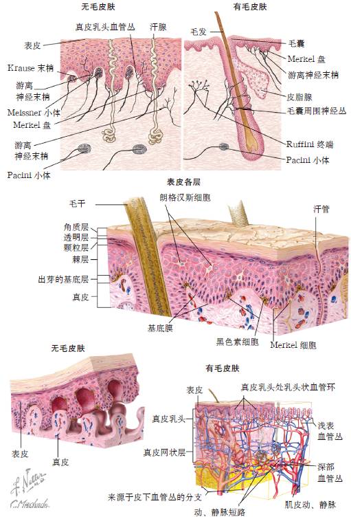 表皮以角质形成细胞为主,还包括黑色素细胞、朗格汉斯细胞、Merkel 细胞。表皮无血管,通过真皮乳头浅表血管丛吸收营养。