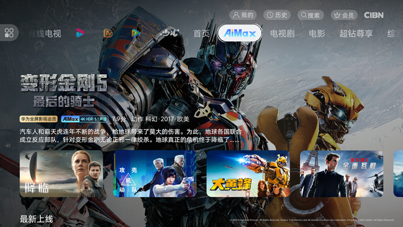 在家庭观影场景方面,华为视频提供的高质量视听服务品牌AiMax,采用4K+HDR+5.1声道业内领先的内容质量标准作为准入标准,在此基础上,部分影片支持HDR Vivid和Audio Vivid标准。通过提升影音作品的画质、色彩和音效,并适配终端设备呈现,使影音作品画质超凡清晰,纤毫毕现;色彩更真实,明暗细节更丰富,还原人眼所见的效果;并且让声音在观众四周活起来,感受到它们的方位和层次,实现惊艳的真实感,带来沉浸式观影体验。