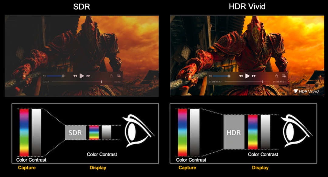 与传统的SDR(标准动态范围)相比,HDR Vivid高光亮度是其40倍。HDR Vivid视频标准的色域面积比BT.709增加70%,覆盖自然界所有表面颜色,可以更真实自然地呈现色彩。HDR Vivid也能根据显示硬件和视频场景,逐帧动态调整画面的亮度和色彩,智能计算每个场景的色彩和亮度范围,并解决亮度和色彩信息在传统的后期、母版制作、分发、显示环节丢失的问题。