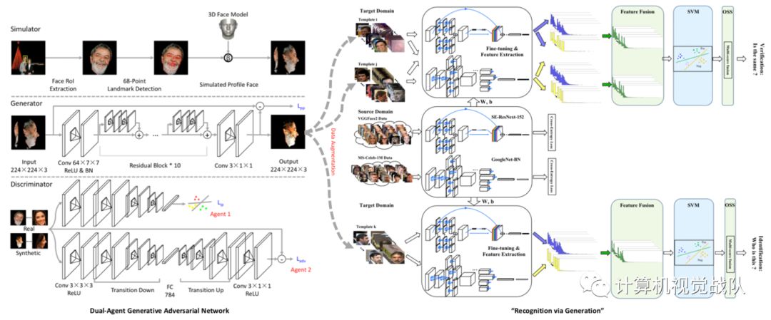 主要提出一种Dual-Agent生成对抗网络(DA-GaN)模型,该模型能够提高真实人脸仿真器输出的真实感,同时在真实感细化过程中保留身份信息。Dual-Agent是专为区分真伪和身份而设计的。特别是使用现成的三维人脸模型作为模拟器来生成不同姿态的轮廓人脸图像,Da-GAN利用FCN作为发生器,利用自动编码器作为Dual-Agent的判别器,除了新的结构外,还对标准GAN进行了几个关键的修改,以保持姿态和纹理,保持身份和稳定训练过程:(1)姿态感知损失;(2)身份感知损失;(3)具有边界平衡正则项的对抗性损失。此外,所提出的DA-GAN也是一种更有效地解决通用迁移学习问题的新方法。