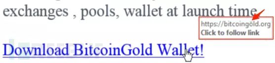 其中一例攻击样本为,伪装为比特币黄金(BTG)钱包应用,和假冒恶意网站hxxps://xn—bitcoingld-lcb[.]org/,邮件内容中又内置了一个与合法比特币黄金官网(https://bitcoingold.org/)相似的恶意网站hxxps://bitcoingöld[.]org,注意后面网站字母o上多了两点ö。钓鱼邮件发件地址为 info@xn—bitcoingod-8yb[.]com、info@xn—bitcoigold-o1b[.]com 和tech@xn—bitcoingld-lcb[.]org。