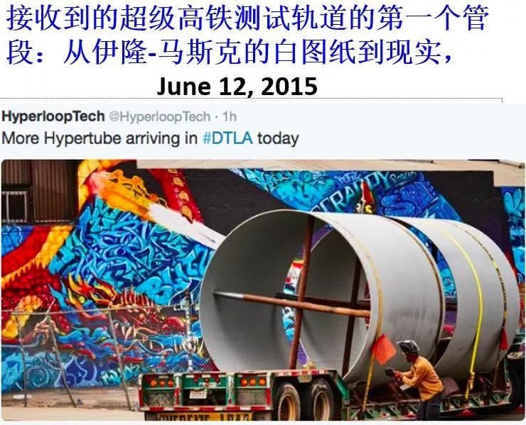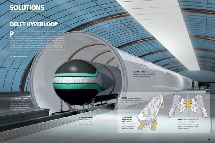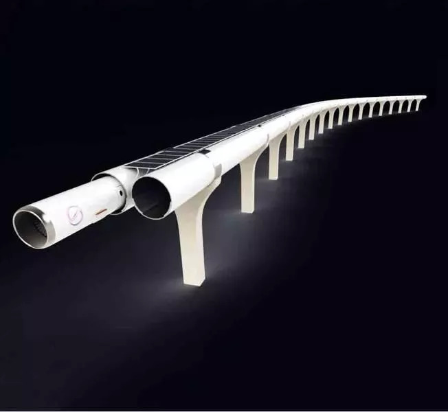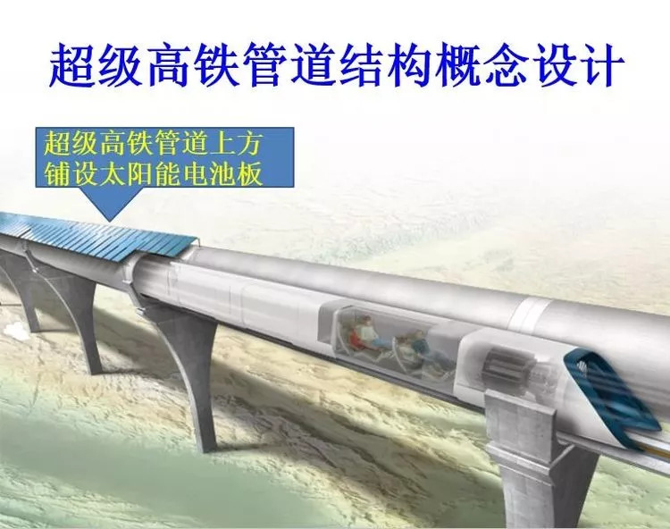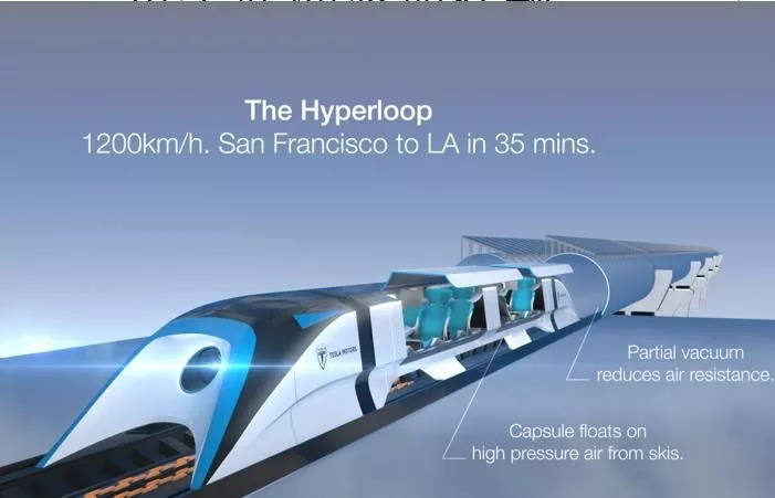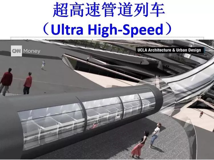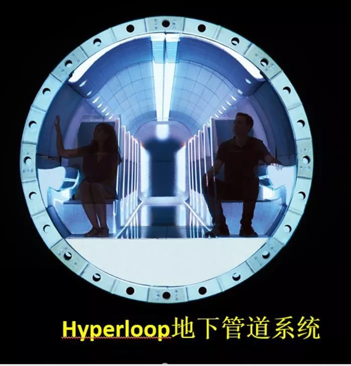 美国的特斯拉和空间探索技术公司的CEO埃隆.马斯克将其命名为“超级高铁”(Hyperloop),这种真空管道运输的交通工具像一个“胶囊”,每一个胶囊被放置于真空管道中,利用太阳能,像炮弹一样被发射至目的地,目前是每小时1000公里(由于在近乎真空环境,速度有大幅提高可能,设想将来时速每小时达4000公里以上),并将是新的城市景观。现在正在加紧施工中!