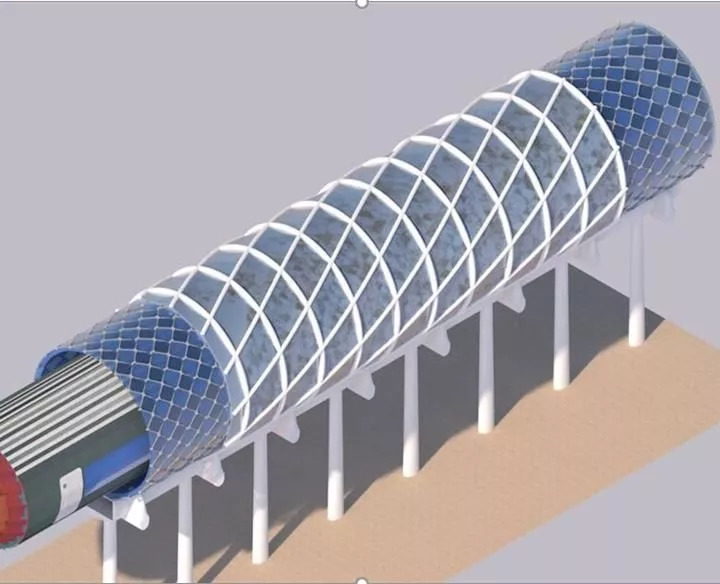 设想中的超级高铁轨道的管路,其上是太阳能板集热器。
