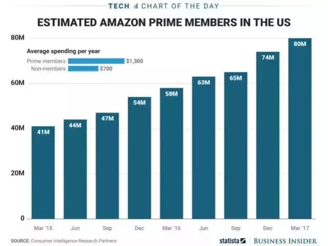 近三年美国的armazon Prime会员数量增长