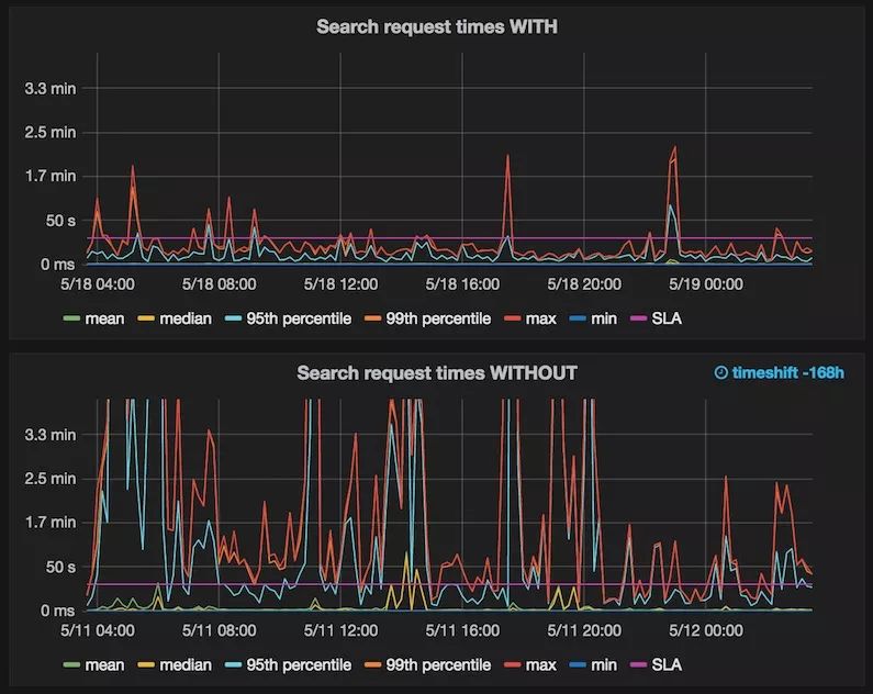 图表说明:响应时间。有 / 没有 重写 Lucene 查询执行。同时也表明不再有节点每天发生多次内存不足的情况。