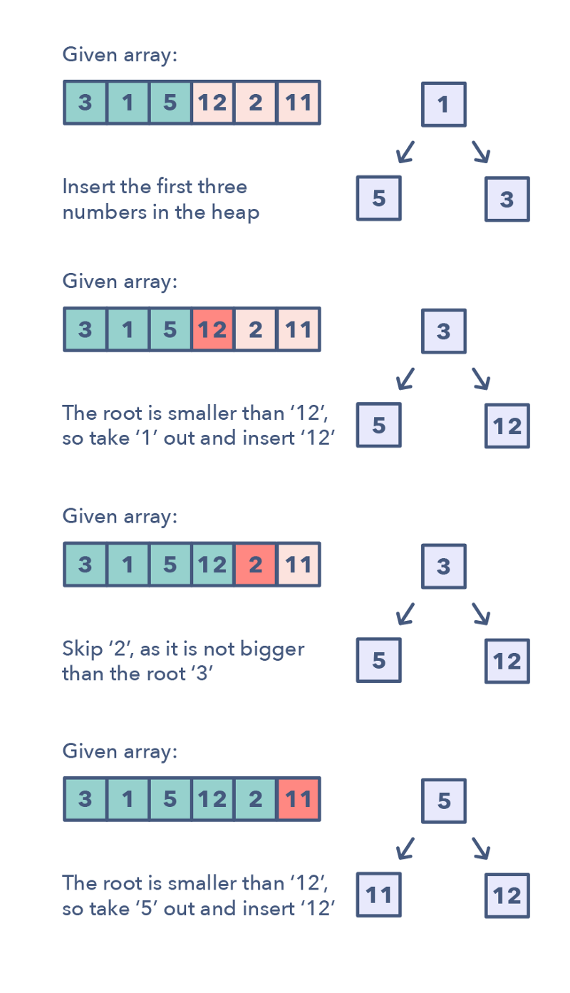 跟踪'K'元素的最佳数据结构是Heap。这种模式将利用Heap来解决从一组给定元素一次处理'K'元素的多个问题。大致思路是这样的: