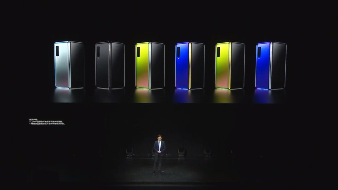 三星 Galaxy Fold 共有夜雾银、量子黑、魔幻绿和星际蓝配色,以及金银铰链配色供消费者选择,预计 2019 年第二季度上市。