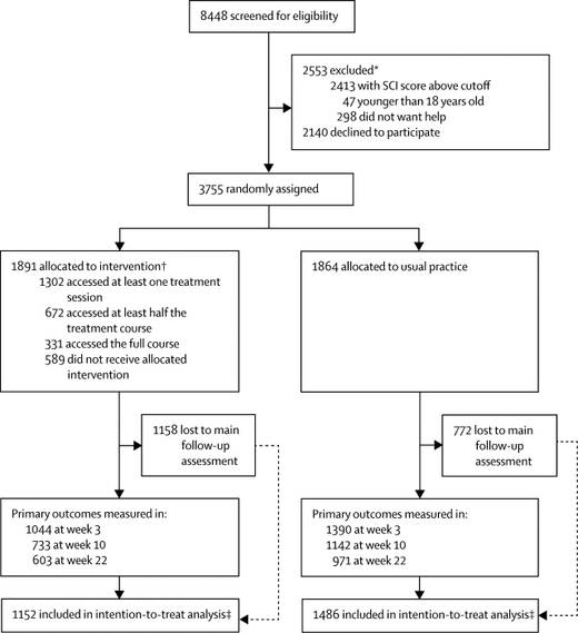 但是作者们也承认,中途停止研究的受测者也很多,达到了50%,只有18%的人完成了所有6次的CBT治疗。他们补充说,他们也为这些退出研究的人考虑到了很多不同的场景,包括他们的精神健康状况与继续参与研究的人变化相同,或者变得更糟,而所有的这些场景都能得到相同的结论。