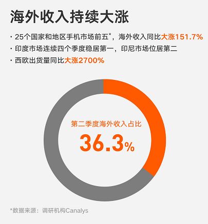 小米作为其中的佼佼者,Q2季度成绩不俗。小米该季度海外收入达164亿元,同比增长151.7%,占比达36.3%。其中在印度市场取得按出货量计市场份额和增速双料第一;在印尼轻取增速冠军、出货量亚军;其西欧出货量同比暴增2700%,在全球25个国家和地区跻身市场前五。
