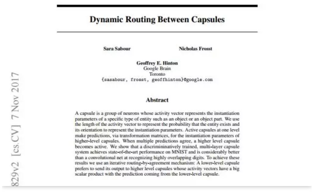 2011年,Hinton认为目前的图像识别方法在智力上表现不够好,提出了“胶囊”的概念。数年之后,2017年10月,则在机器学习的顶级会议“神经信息处理系统大会(NIPS)”上发表了题为《胶囊之间的动态路由》的论文,提出了全新的深度学习方法——胶囊网络(CapsNet)。