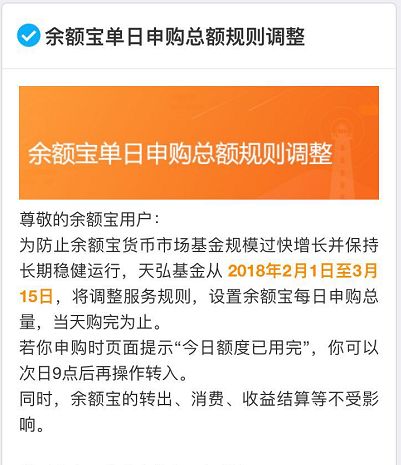 自2018年2月1日起,天弘基金调整了余额宝服务规则,余额宝正式开始“限购”,官方设置了每日申购总额,也就是说,拥有3亿用户的庞大货币基金,不是你想买就能买的了。