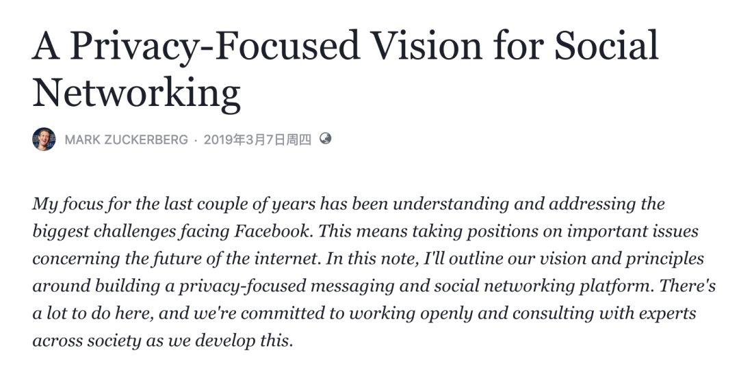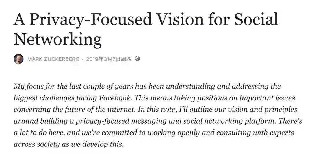 马克扎克伯格当时在帖子中说:我知道很多人认为Facebook不愿意以隐私为重点重建平台,坦率的说,在构建隐私保护方面,我们目前在外界的声誉并不好,且我们一直在关注更为开放的互联网分享工具。