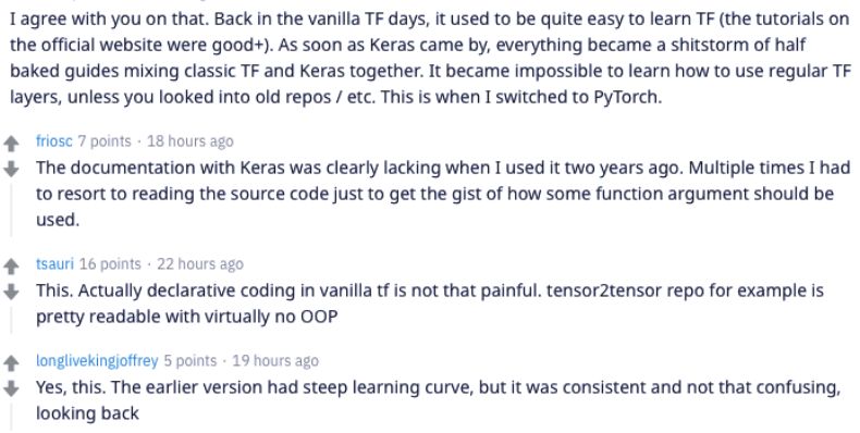 除了这两个问题,很多人还是回到了吐槽 Keras 和 TF 的结合上。