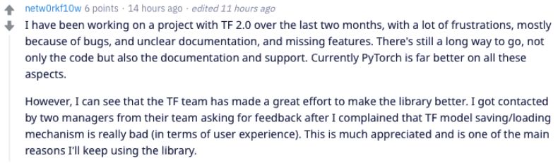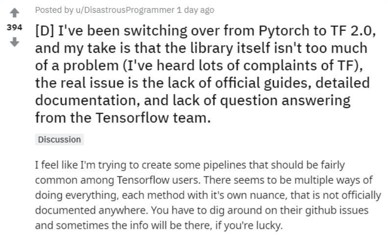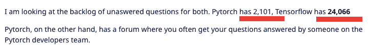 最后,ta 发现网上有很多关于 TF 的提问,但却没人回答,有些甚至是一年前提出的。这些问题质量很高,而且都是官方文档里没有提及的。相比之下,PyTorch 有一个论坛,在上面问问题可以得到 PyTorch 开发人员的解答,这方面要比 TensorFlow 好太多。