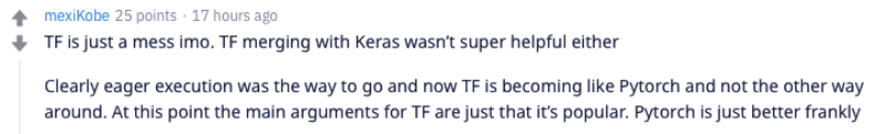 https://www.reddit.com/r/MachineLearning/comments/e4pxqp/d_ive_been_switching_over_from_pytorch_to_tf_20/