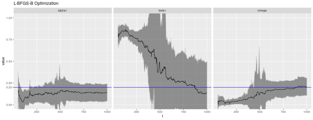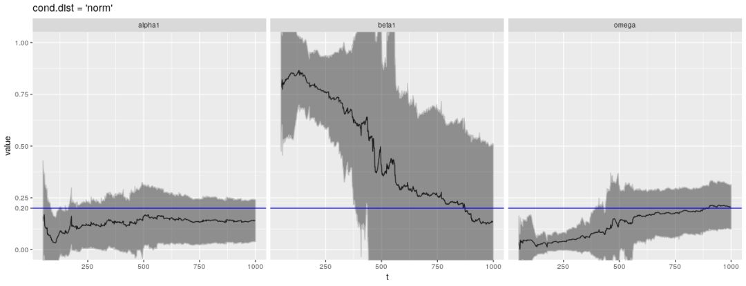 我用 rugarch 进行了一次快速实验,看起来它同样被这个问题困扰。下面是我运行的代码,我会尽快在明天贴出一份全面的研究。