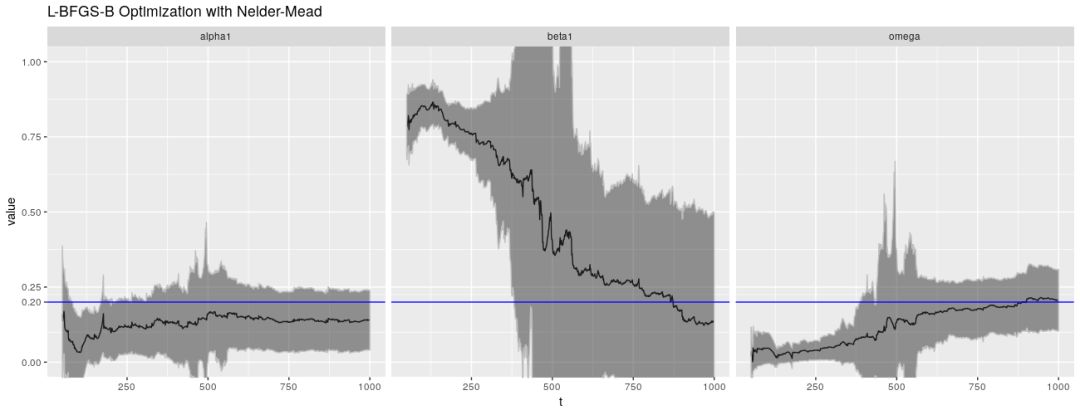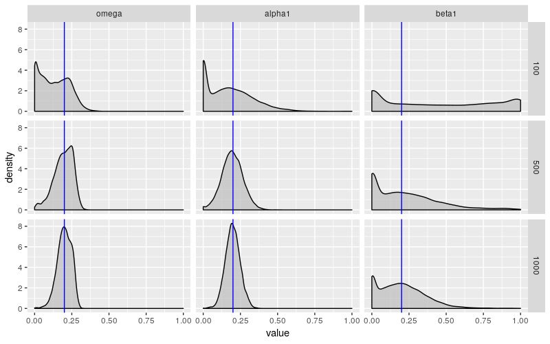 当样本量为 100 时,这些估计远非可靠。ω和α以一种令人不安的倾向趋近于 0,而β几乎可以说是任何东西。如上所述,garchFit() 报告的标准差不会捕获这种行为。对于较大的样本量,ω和α表现得更好,但β仍显示出令人不安的行为。它的变化幅度几乎没有变化,并且它仍然有过小的倾向。