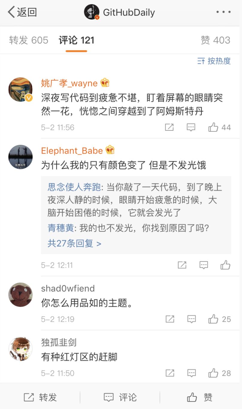 结果在 GitHub 上找到一个令人纸醉金迷的 VSCode 主题,GitHubDaily 还着重推荐过,微博上的留言纷纷表示这也太骚气了。