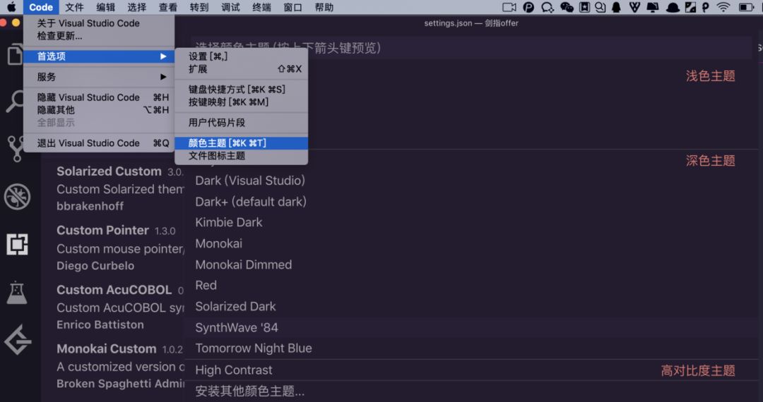 打开“Code”-->“首选项”-->“设置”-->“settings.json”