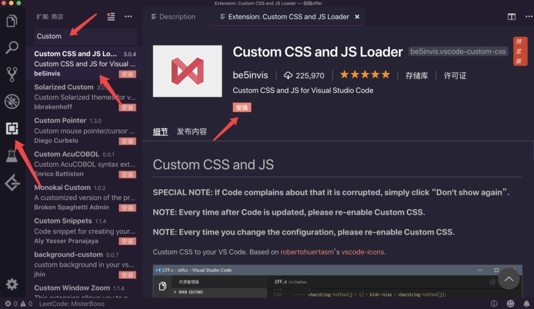 在 VSCode 扩展商店中搜索“Custom CSS and JS Loader”,这个插件用于加载自定义的 CSS 或 JS 文件,点击安装