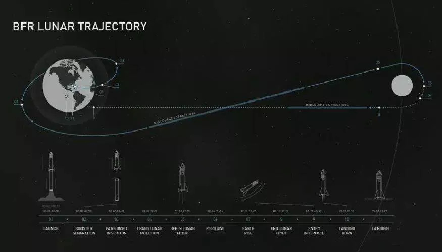 根据直播现场图片显示,绕月飞行任务将有BFR搭载BFS飞船完成。BFR火箭将BFS飞船送出地球完成分离,然后BFS飞船将先完成绕地然后再飞往月球绕行。从给出的图片看,返回地球的着落点应该是加州。