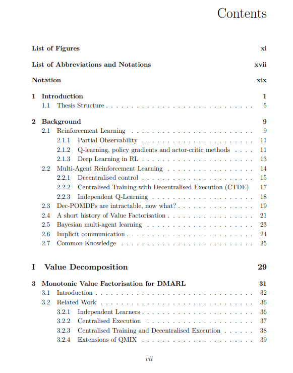 综上所述,本论文在集中训练与分散执行框架下的协同控制的深度多智能体强化和两个相关的新基准套件中提出了一些重要贡献。在此背景下,我们对价值分解、在多智能体学习中使用公共知识以及如何有效地学习隐式通信协议做出了贡献。