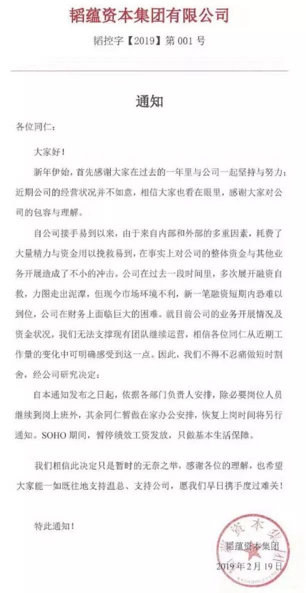 2月19日消息,有消息称易到用车大股东韬蕴资本发布内部通知称,公司因耗费大量资金挽救易到,融资自救难以到位,目前已无法支撑现有团队继续运营。即日起,公司各部门负责人将安排员工在家办公,期间暂停绩效工资发放。当日晚间,韬蕴资本董事长温晓东回应腾讯《一线》称,缩编求存。