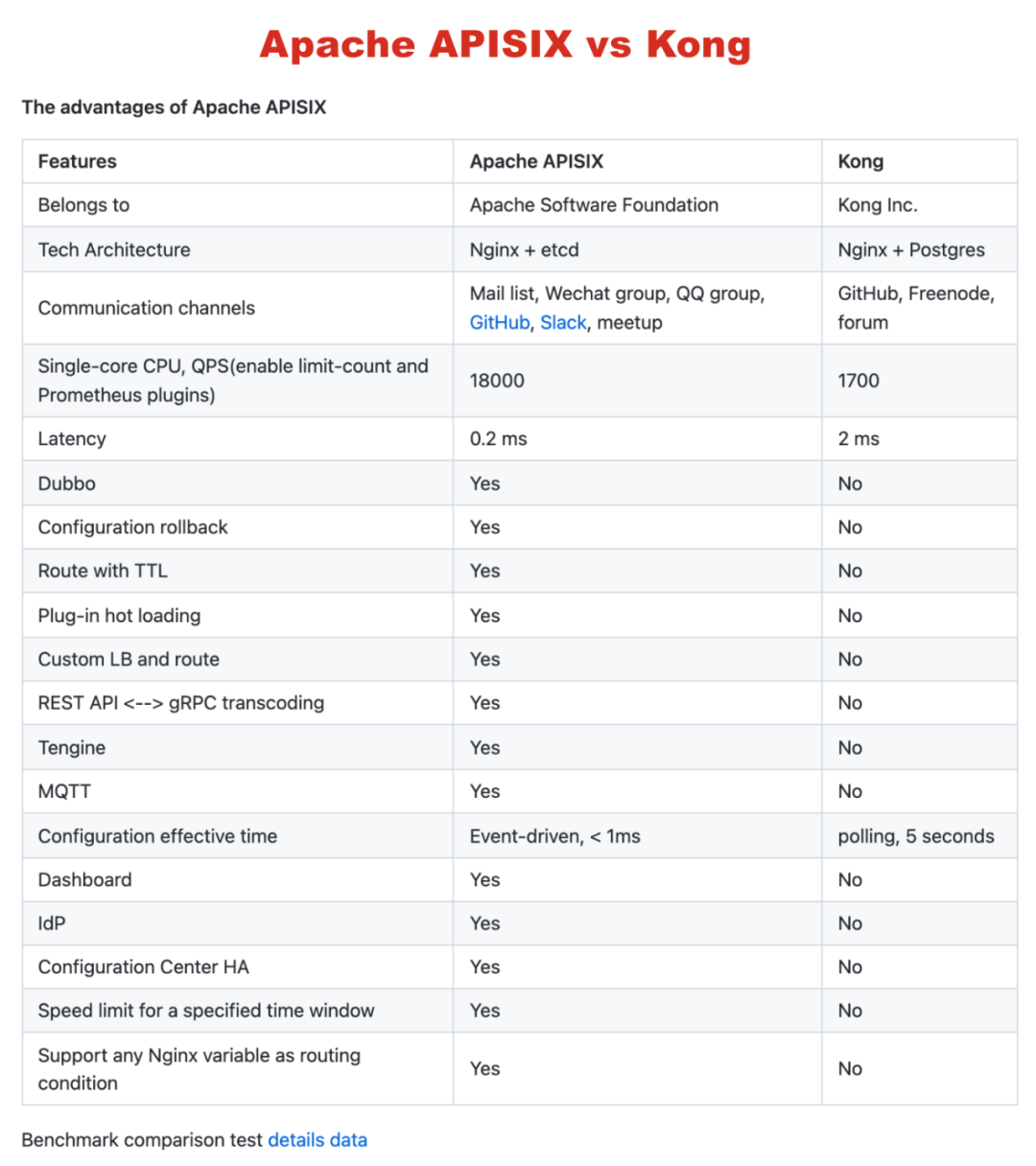 进一步调研时,我们发现了 Apache APISIX。首先 Apache APISIX 的性能比 Kong 强,在 Apache APISIX 的 GitHub Readme 中有个非常详细的对比图,列出了两者的性能测试差距,这与我们自己测试下来的数据基本一致。