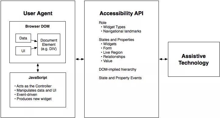 每个系统都有一套底层的 Accessibility APIs 用于向 AT 设备传递系统自带 GUI 的可访问性信息和交互事件;各 UA 和 AT 设备在不同程度上实现对 Accessibility APIs 的支持,两者通过系统底层的 Accessibility API 进行信息交互; UA 将 DOM 中的可访问信息映射到底层 Accessibility APIs 中,AT设备通过访问底层的 Accessibility APIs 来获取信息,但也有极少 AT 设备是直接通过访问 DOM 结构来获取页面可访问信息。当用户通过 AT 设备进行操作时可以修改 Accessibility APIs 中 states or properties 的值,UA 监听到变化改变 web 应用的状态;图解如下:
