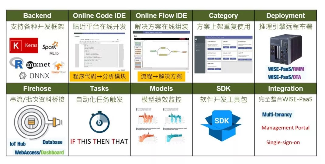 对于工业数据价值的深层挖掘一直是业内难题,其中一个原因便是受制于数据建模的成本和能力。对此,研华WISE-PaaS推出数据分析服务框架,提供丰富的模块化数据科学能力: