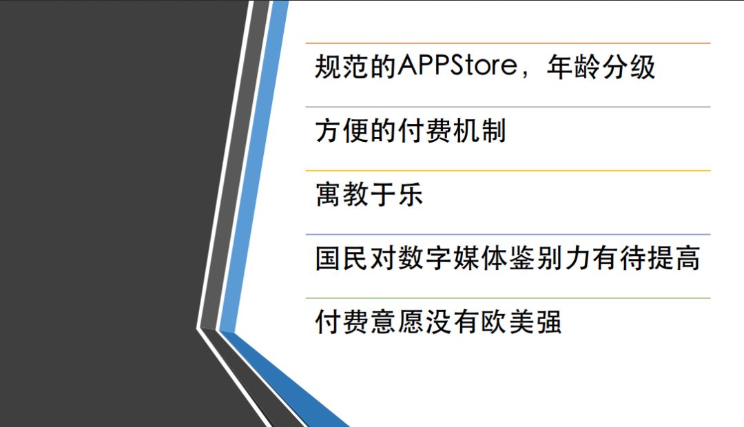 张老师最后总结了苹果的APP store下载使用APP学习的优势——有年龄分级、方便的付费机制,寓教于乐,也提出了国民对数字媒体鉴别力有待提高,付费意愿没有欧美高这两方面的问题。