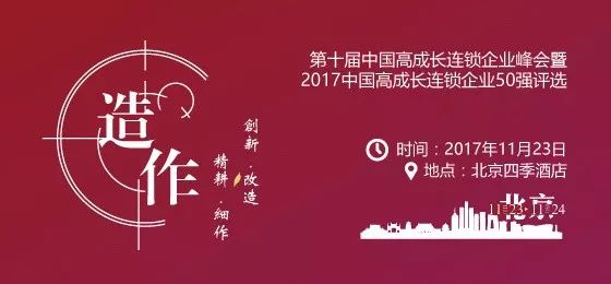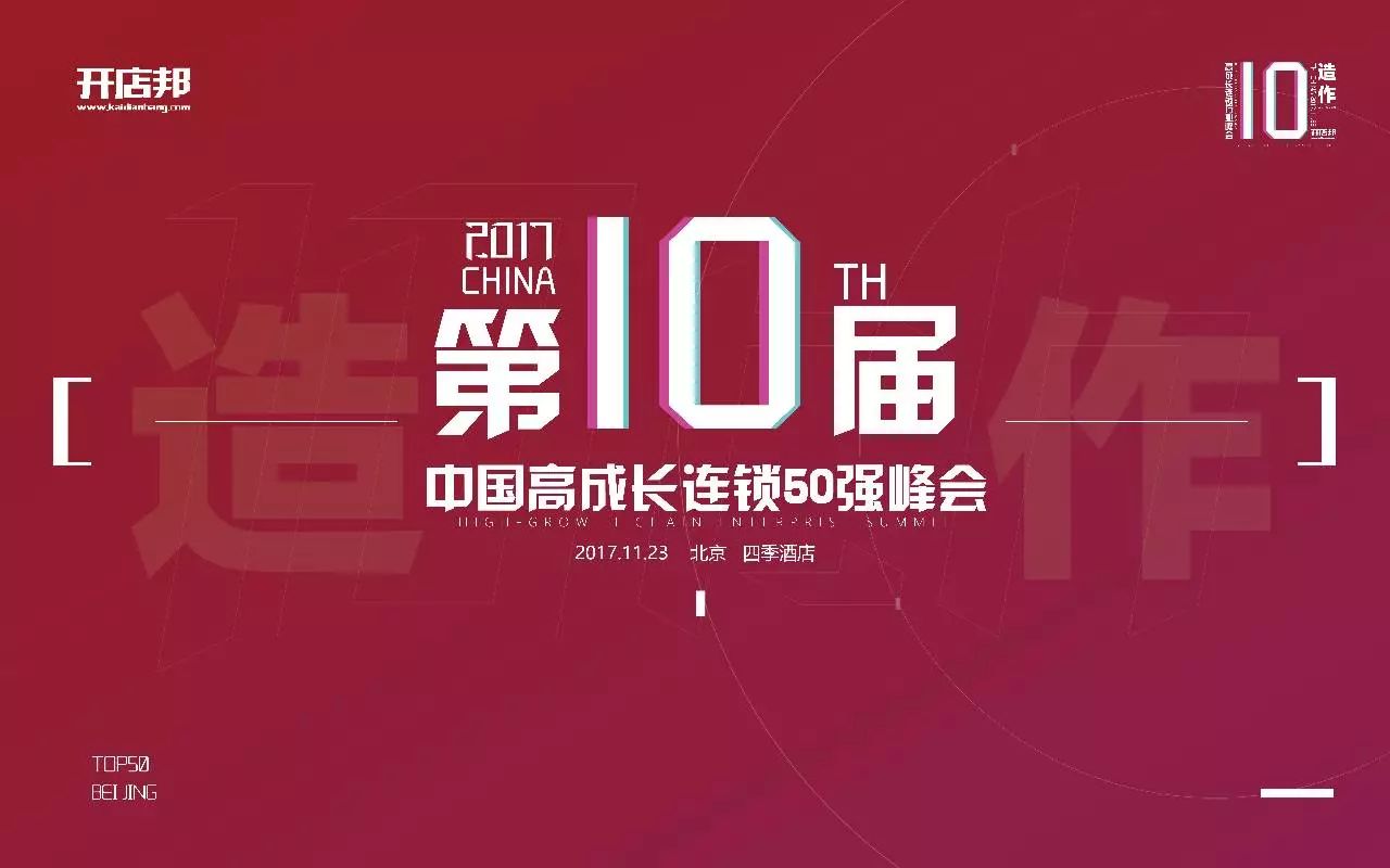 开店邦每年一期的“中国高成长连锁50强”榜单,不仅在于告知连锁行业的发展新锐与成长之星,更多是发现一种趋势,服务于更广泛的连锁品牌和创业投资者,了解市场动态,洞悉行业舆情,更准确、更高效地实现投入产出的正向回报。11月23日,开店邦主办的第十届中国高成长连锁企业峰会暨2017年中国高成长连锁品牌颁奖典礼将在北京四季酒店隆重开幕。上榜的优秀企业家、行业观察家、投资界大咖等近千人欢聚一堂,共同交流与探讨行业发展趋势,分享企业成功经验。