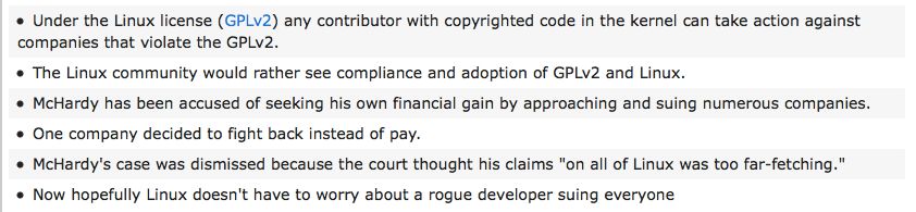 正是利用了以上法律逻辑漏洞,McHardy 才获得了一些利益,这在 Linux 社区早已是司空见惯。