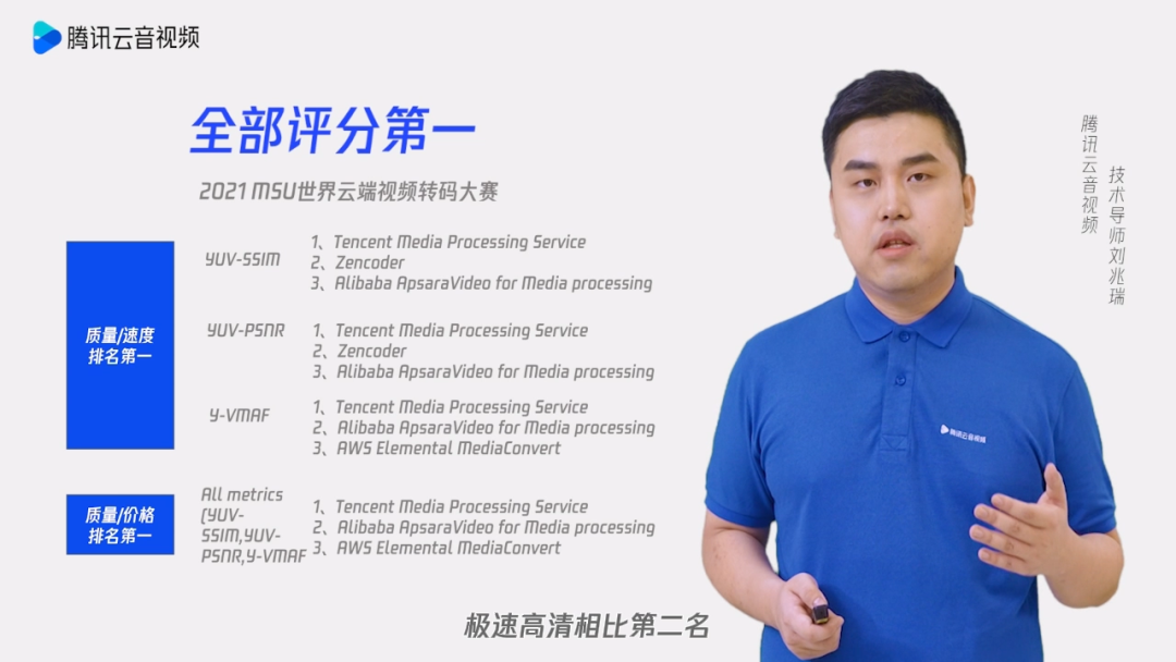 在编码器内核方面,腾讯明眸·极速高清引入了很多领先的技术。2021 年的 MUS 云端编码大赛上,腾讯明眸取得了多项第一的成绩,尤其在视频编码质量评测上,相比第二名有 20% 的编码增益。除此之外,在 H.266/VVC 等下一代编码器上,我们也拥有 100 项以上的专利。