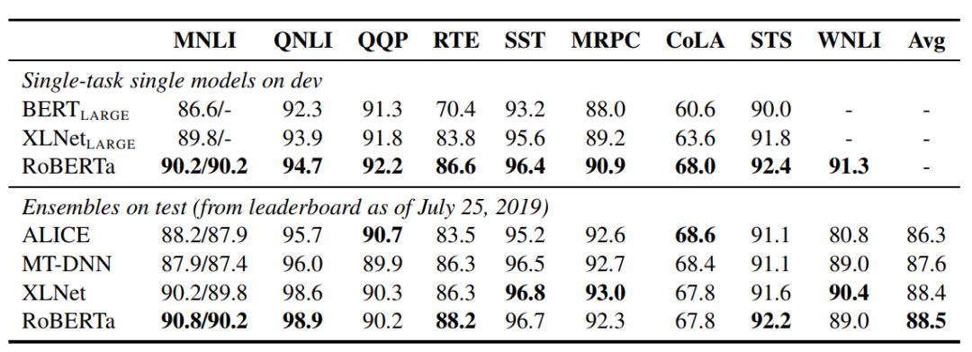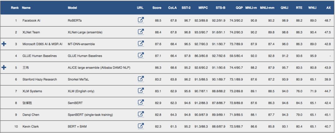 BERT 自诞生以来就展现出了卓越的性能,GLUE 排行榜上前几名的模型一度也大多使用 BERT。然而,XLNet 的横空出世,打破了 BERT 的纪录。不过,不久之后,剧情再次出现反转,Facebook 创建的改进版 BERT——RoBERTa,登上了 GLUE 排行榜榜首。