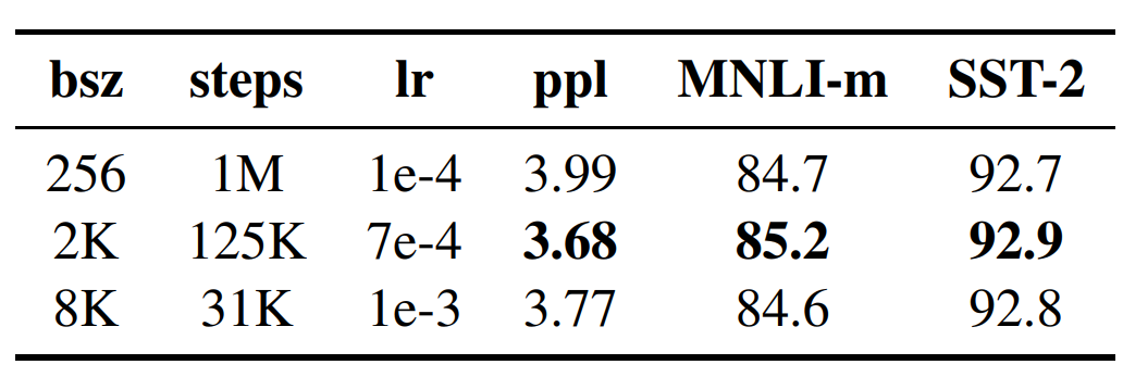 表 3:在 BOOKCORPUS 和 WIKIPEDIA 上用不同的 batch 大小(bsz)训练的基础模型在留出训练数据(ppl)和开发集上的困惑度。