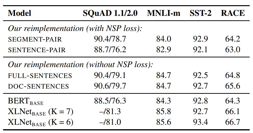 SEGMENT-PAIR+NSP:这种方式和 BERT 中用到的原始输入格式相同,NSP 是 Next Sentence Prediction(下一句预测)结构的缩写。