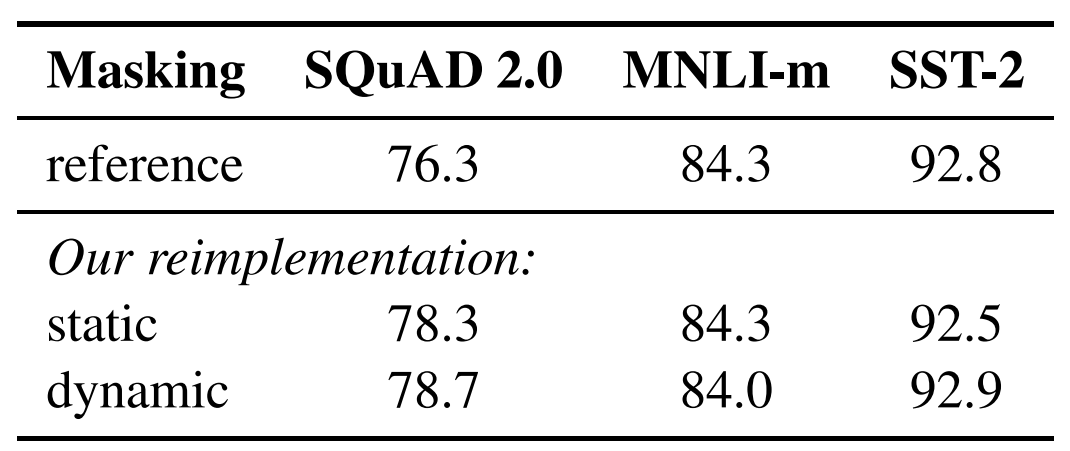 BERT 依赖随机掩码和预测 token。原版的 BERT 实现在数据预处理期间执行一次掩码,得到一个静态掩码。Facebook 研究者将该策略与动态掩码进行比较,动态掩码即,每次向模型输入一个序列时都会生成掩码模式。在预训练进行更多步或使用更大的数据集时,这点变得尤其重要。