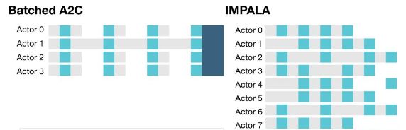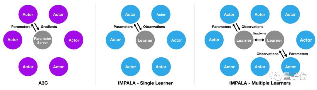 IMPALA的灵感来自于热门的A3C架构,后者使用多个分布式actor来学习agent的参数。在类似这样的模型中,每个actor都使用策略参数的一个副本,在环境中操作。actor会周期性地暂停探索,将它们已经计算得出的梯度信息分享至中央参数服务器,而后者会对此进行更新。