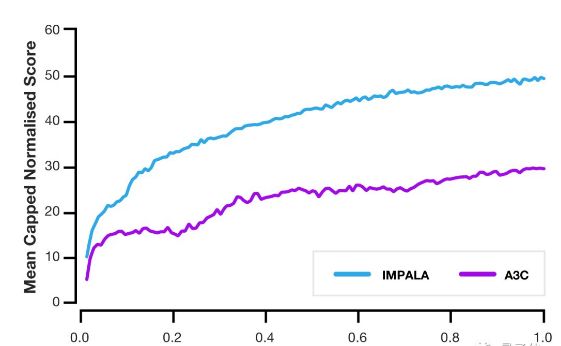 不过操作和学习的解耦也导致,actor的策略落后于learner。为了弥补这样的差距,我们引入了离策略优势actor-评价者公式V-trace。它弥补了离策略actor获得的轨迹。你可以从我们的论文中了解算法及其分析细节。