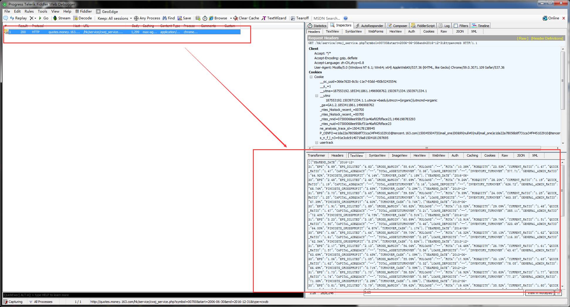 在时间选择框这里,我们可以获取到一共有哪些时间的财务报表。点击查询按钮,我们就可以进行查询,对点击主要财务指标的查询按钮这个动作,使用 Fiddler 进行抓包分析。