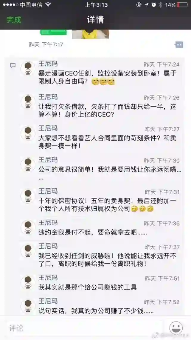 除此之外,自称是王尼玛扮演者的微信帐号“暴走小员工”近日还在其朋友圈连发数条信息,称自己受到了不公正的待遇,除了被监控威胁,他还指出,自己与公司的签约合同十分苛刻,十年保密协议、五年卖身契,另外附加个人所有技术归属权为公司。他还表示自己就是公司赚钱的工具。