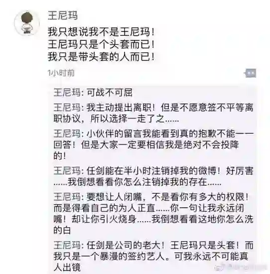 “任剑是公司的老大!王尼玛只是头套!而我只是一个暴漫的签约艺人。可我永远不可能真人出镜。”王尼玛(或为扮演者)在其朋友圈写到。