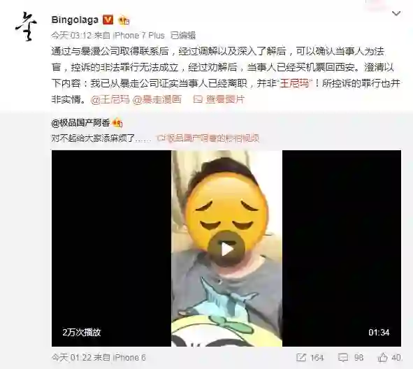 微博帐号“极品国产阿香”在今日凌晨时分,也发布一条澄清视频,表示“真的很对不起大家,让大家操碎了心......”。此前的爆料大V“Bingolaga”也转发了该视频,并做出了澄清。