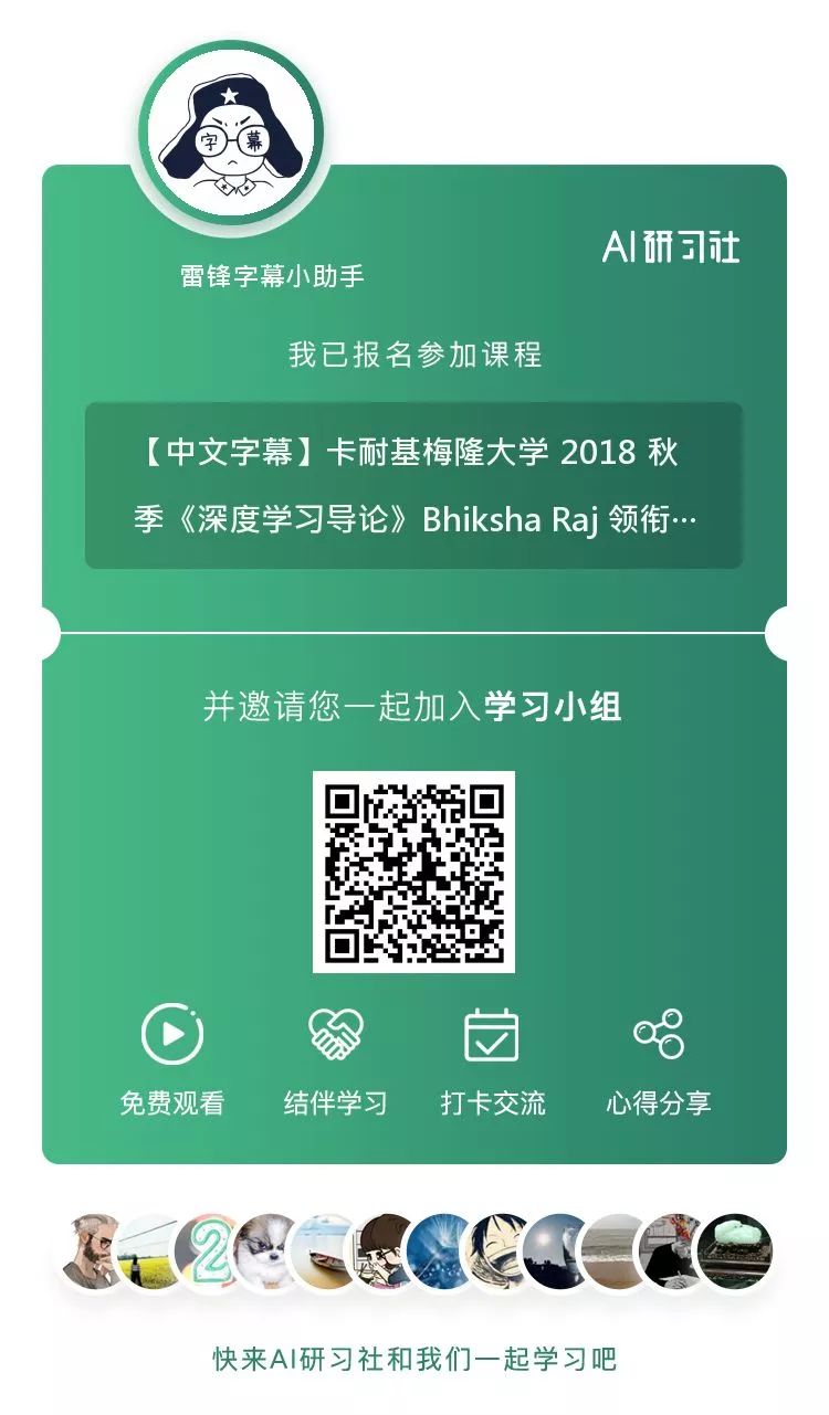 CMU 2018 秋季《深度学习导论》为官方开源最新版本,由卡耐基梅隆大学教授 Bhiksha Raj 授权 AI 研习社翻译。9 月 27 日开始正式同步更新在 AI 研习社,跟随官网课程节奏而更新。观看网址:http://www.mooc.ai/course/562(长按下方二维码或者点击文末阅读原文)