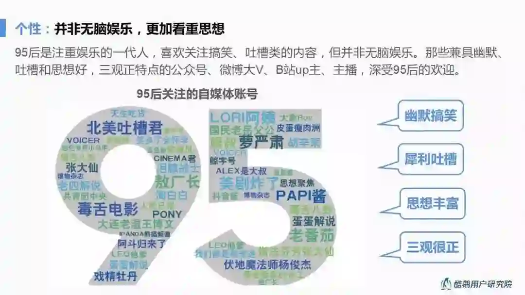 95后爱娱乐,但不是"娱乐至死"的一代,更加青睐有思想、有质量的内容,以幽默风趣的形式呈现严肃正能量的内容,会乐于被95后接受。